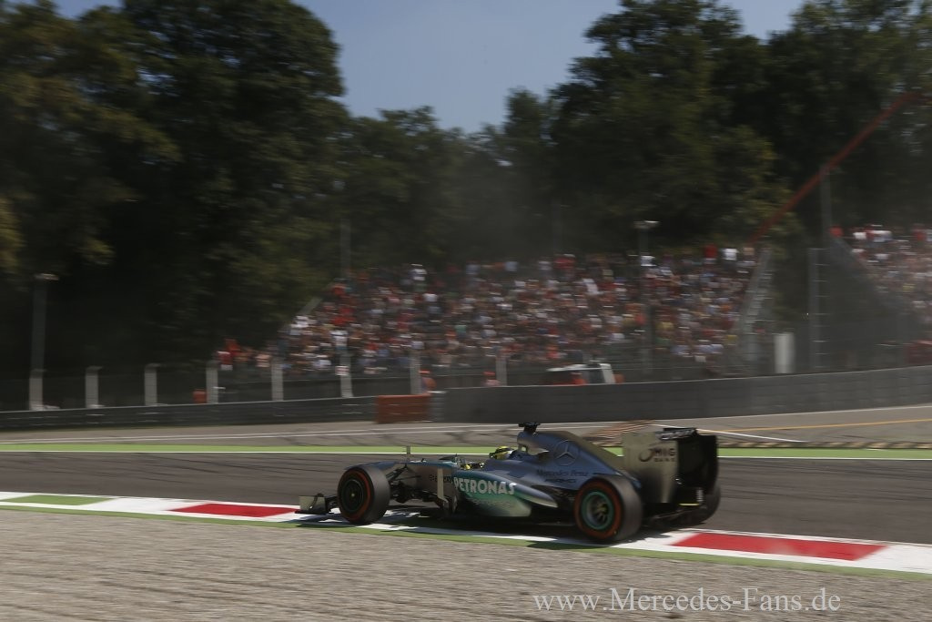 Die Mercedes-Werksfahrer Nico Rosberg und Lewis Hamilton beendeten den Großen Preis von Italien in Monza auf den Positionen sechs und neun. Hamilton hatte auf seinem ersten Satz Prime-Reifen einen schleichenden Plattfuß vorne rechts und musste in Folge dessen in Runde 13 vorzeitig an die Box kommen. Nicos Boxenstopp war mit einer Gesamtdurchfahrtszeit von 24.079 Sekunden der schnellste des Rennens. "Wir hatten heute ein sehr schnelles Auto und somit war...,