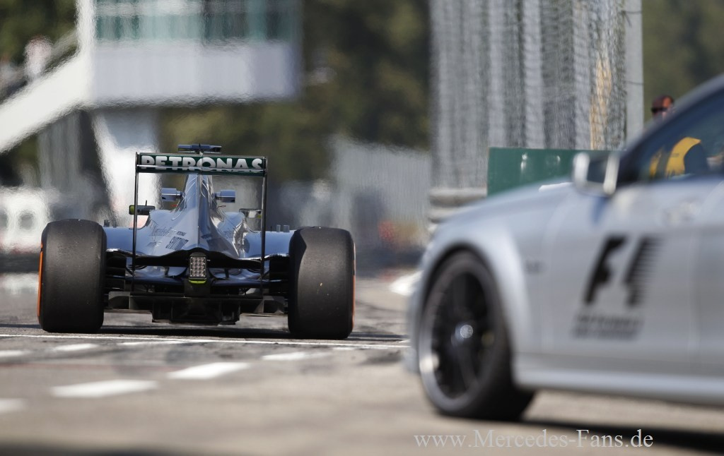 Die Mercedes-Werksfahrer Nico Rosberg und Lewis Hamilton beendeten den Großen Preis von Italien in Monza auf den Positionen sechs und neun. Hamilton hatte auf seinem ersten Satz Prime-Reifen einen schleichenden Plattfuß vorne rechts und musste in Folge dessen in Runde 13 vorzeitig an die Box kommen. Nicos Boxenstopp war mit einer Gesamtdurchfahrtszeit von 24.079 Sekunden der schnellste des Rennens. "Wir hatten heute ein sehr schnelles Auto und somit war...,