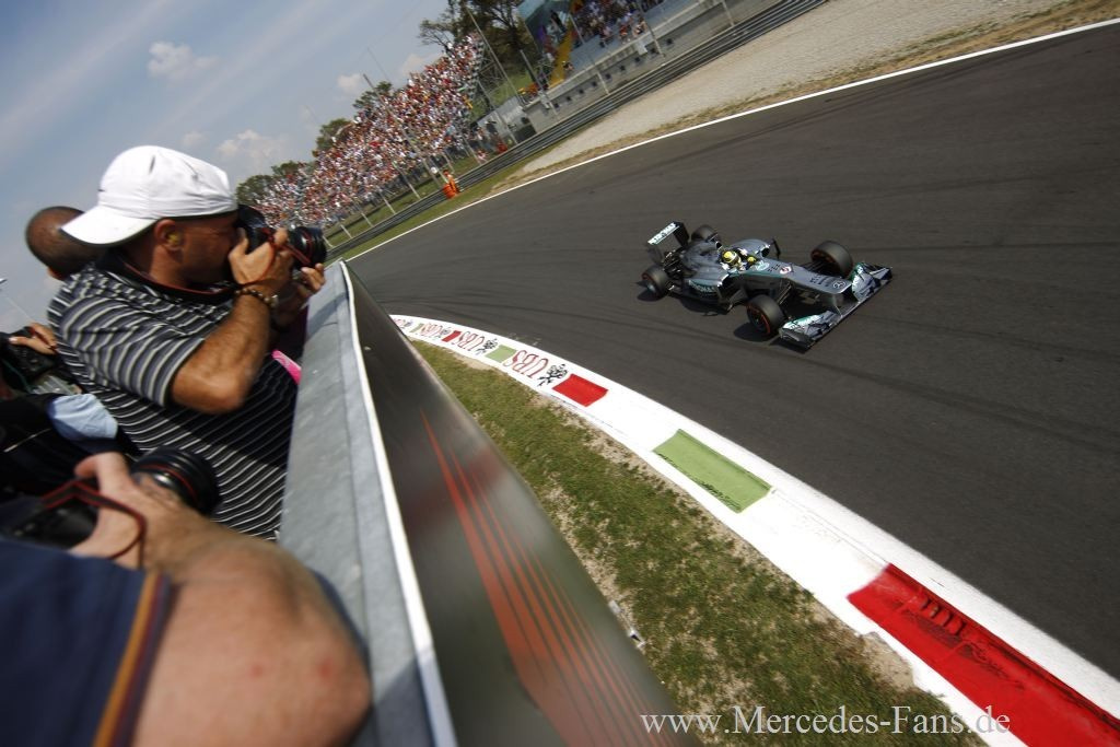 Die Mercedes-Werksfahrer Nico Rosberg und Lewis Hamilton beendeten den Großen Preis von Italien in Monza auf den Positionen sechs und neun. Hamilton hatte auf seinem ersten Satz Prime-Reifen einen schleichenden Plattfuß vorne rechts und musste in Folge dessen in Runde 13 vorzeitig an die Box kommen. Nicos Boxenstopp war mit einer Gesamtdurchfahrtszeit von 24.079 Sekunden der schnellste des Rennens. "Wir hatten heute ein sehr schnelles Auto und somit war...,