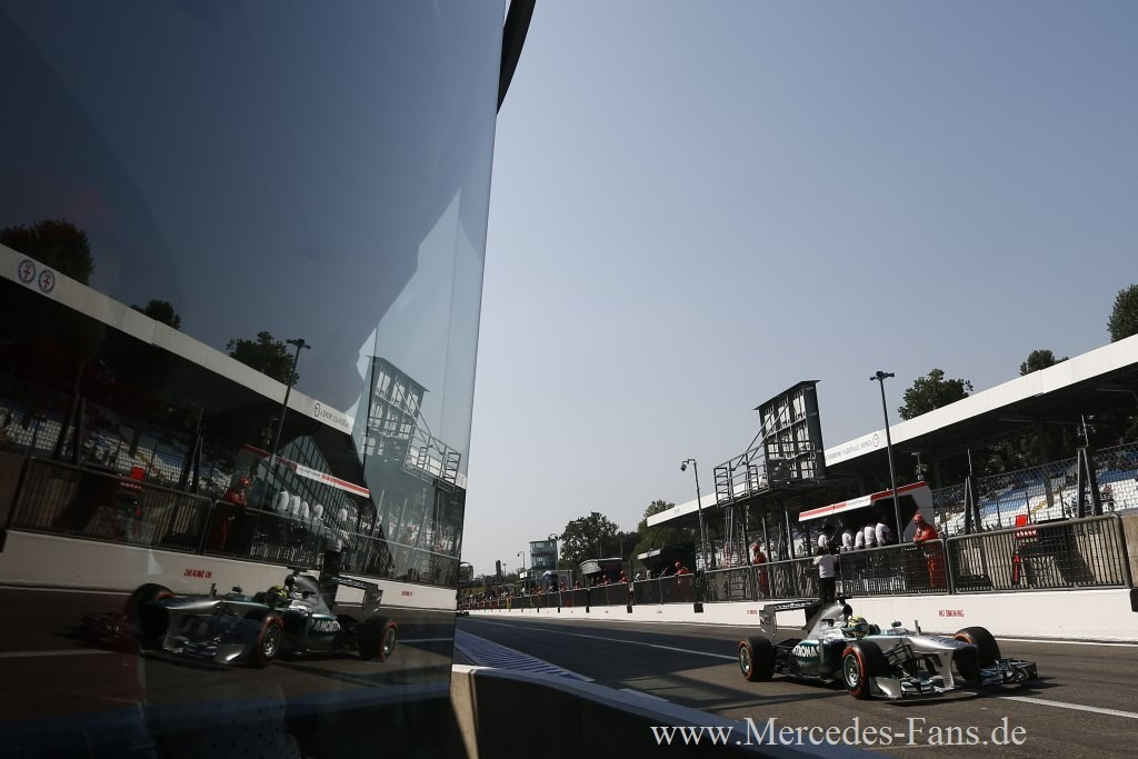 Die Mercedes-Werksfahrer Nico Rosberg und Lewis Hamilton beendeten den Großen Preis von Italien in Monza auf den Positionen sechs und neun. Hamilton hatte auf seinem ersten Satz Prime-Reifen einen schleichenden Plattfuß vorne rechts und musste in Folge dessen in Runde 13 vorzeitig an die Box kommen. Nicos Boxenstopp war mit einer Gesamtdurchfahrtszeit von 24.079 Sekunden der schnellste des Rennens. "Wir hatten heute ein sehr schnelles Auto und somit war...,