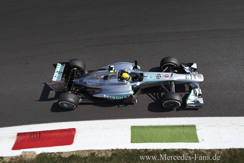 Die Mercedes-Werksfahrer Nico Rosberg und Lewis Hamilton beendeten den Großen Preis von Italien in Monza auf den Positionen sechs und neun. Hamilton hatte auf seinem ersten Satz Prime-Reifen einen schleichenden Plattfuß vorne rechts und musste in Folge dessen in Runde 13 vorzeitig an die Box kommen. Nicos Boxenstopp war mit einer Gesamtdurchfahrtszeit von 24.079 Sekunden der schnellste des Rennens. "Wir hatten heute ein sehr schnelles Auto und somit war...,