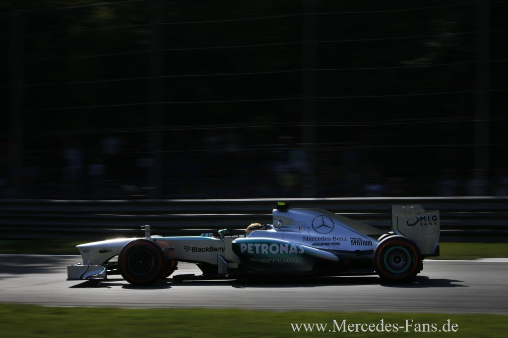 Die Mercedes-Werksfahrer Nico Rosberg und Lewis Hamilton beendeten den Großen Preis von Italien in Monza auf den Positionen sechs und neun. Hamilton hatte auf seinem ersten Satz Prime-Reifen einen schleichenden Plattfuß vorne rechts und musste in Folge dessen in Runde 13 vorzeitig an die Box kommen. Nicos Boxenstopp war mit einer Gesamtdurchfahrtszeit von 24.079 Sekunden der schnellste des Rennens. "Wir hatten heute ein sehr schnelles Auto und somit war...,