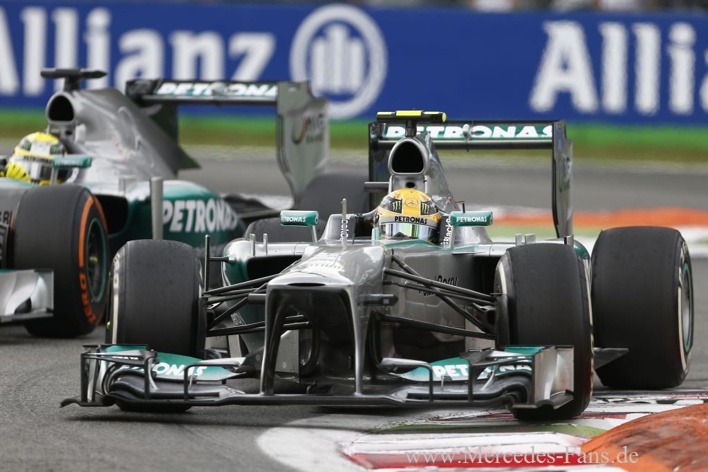 Die Mercedes-Werksfahrer Nico Rosberg und Lewis Hamilton beendeten den Großen Preis von Italien in Monza auf den Positionen sechs und neun. Hamilton hatte auf seinem ersten Satz Prime-Reifen einen schleichenden Plattfuß vorne rechts und musste in Folge dessen in Runde 13 vorzeitig an die Box kommen. Nicos Boxenstopp war mit einer Gesamtdurchfahrtszeit von 24.079 Sekunden der schnellste des Rennens. "Wir hatten heute ein sehr schnelles Auto und somit war...,