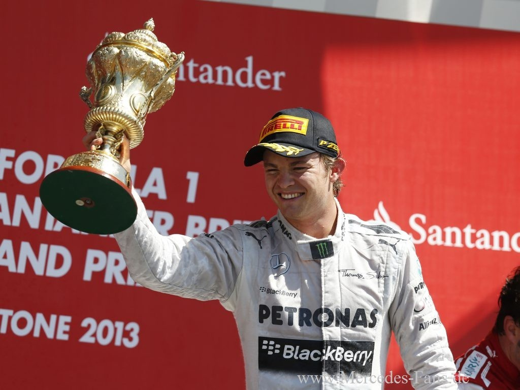 Sieg für die Silberpfeile in Silverstone: Nico Rosberg gewann den Großen Preis von Großbritannien. Es war nach dem Erfolg in Monaco sein zweiter Sieg in der Formel 1-Saison 2013. Lewis Hamilton überquerte die Ziellinie beim Heimrennen von MERCEDES AMG PETRONAS in Silverstone als Vierter. Hamilton verteidigte seine Pole Position mit einem guten Start und konnte sich schnell vom Rest des Feldes absetzen. Rosberg hingegen verlor von Startplatz zwei eine Position.