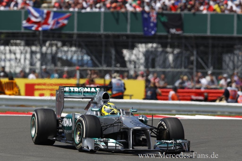 Sieg für die Silberpfeile in Silverstone: Nico Rosberg gewann den Großen Preis von Großbritannien. Es war nach dem Erfolg in Monaco sein zweiter Sieg in der Formel 1-Saison 2013. Lewis Hamilton überquerte die Ziellinie beim Heimrennen von MERCEDES AMG PETRONAS in Silverstone als Vierter. Hamilton verteidigte seine Pole Position mit einem guten Start und konnte sich schnell vom Rest des Feldes absetzen. Rosberg hingegen verlor von Startplatz zwei eine Position.