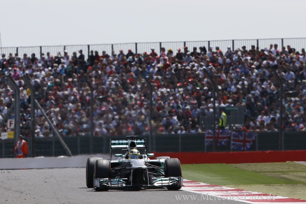 Sieg für die Silberpfeile in Silverstone: Nico Rosberg gewann den Großen Preis von Großbritannien. Es war nach dem Erfolg in Monaco sein zweiter Sieg in der Formel 1-Saison 2013. Lewis Hamilton überquerte die Ziellinie beim Heimrennen von MERCEDES AMG PETRONAS in Silverstone als Vierter. Hamilton verteidigte seine Pole Position mit einem guten Start und konnte sich schnell vom Rest des Feldes absetzen. Rosberg hingegen verlor von Startplatz zwei eine Position.