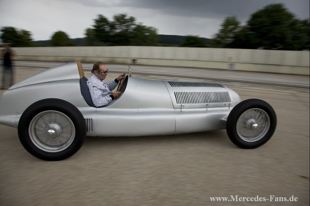 In diesem Jahr feiert Mercedes-Benz 75 Jahre Silberpfeil. Anlässlich der Jubiläumsfeierlichkeiten kamen Formel-1-Pilot Lewis Hamilton und Mercedes-Benz Motorsportchef Norbert Haug zum das Mercedes-Benz Museum nach Stuttgart. Dort sollte im Rahmen der Feier das Weltmeisterfahrzeug von 2008, der MP4-23, per Kran an seinen neuen Platz gehoben werden. Nun sind in der Steilkurve alle legendären Rennwagen seit 1934 zu sehen.