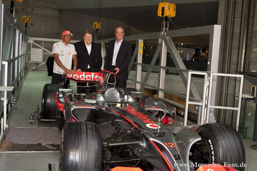 In diesem Jahr feiert Mercedes-Benz 75 Jahre Silberpfeil. Anlässlich der Jubiläumsfeierlichkeiten kamen Formel-1-Pilot Lewis Hamilton und Mercedes-Benz Motorsportchef Norbert Haug zum das Mercedes-Benz Museum nach Stuttgart. Dort sollte im Rahmen der Feier das Weltmeisterfahrzeug von 2008, der MP4-23, per Kran an seinen neuen Platz gehoben werden. Nun sind in der Steilkurve alle legendären Rennwagen seit 1934 zu sehen.