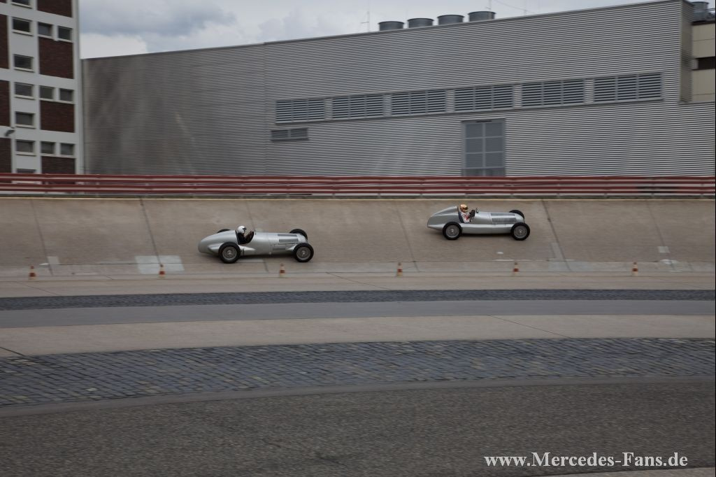 In diesem Jahr feiert Mercedes-Benz 75 Jahre Silberpfeil. Anlässlich der Jubiläumsfeierlichkeiten kamen Formel-1-Pilot Lewis Hamilton und Mercedes-Benz Motorsportchef Norbert Haug zum das Mercedes-Benz Museum nach Stuttgart. Dort sollte im Rahmen der Feier das Weltmeisterfahrzeug von 2008, der MP4-23, per Kran an seinen neuen Platz gehoben werden. Nun sind in der Steilkurve alle legendären Rennwagen seit 1934 zu sehen.