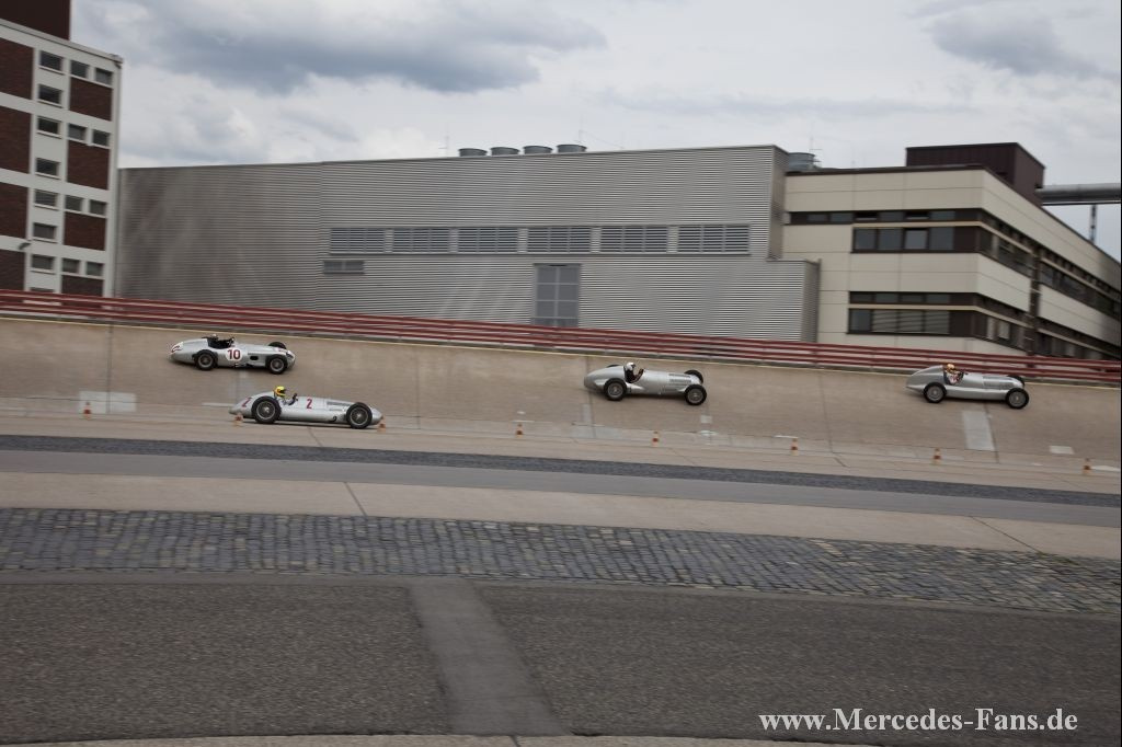 In diesem Jahr feiert Mercedes-Benz 75 Jahre Silberpfeil. Anlässlich der Jubiläumsfeierlichkeiten kamen Formel-1-Pilot Lewis Hamilton und Mercedes-Benz Motorsportchef Norbert Haug zum das Mercedes-Benz Museum nach Stuttgart. Dort sollte im Rahmen der Feier das Weltmeisterfahrzeug von 2008, der MP4-23, per Kran an seinen neuen Platz gehoben werden. Nun sind in der Steilkurve alle legendären Rennwagen seit 1934 zu sehen.