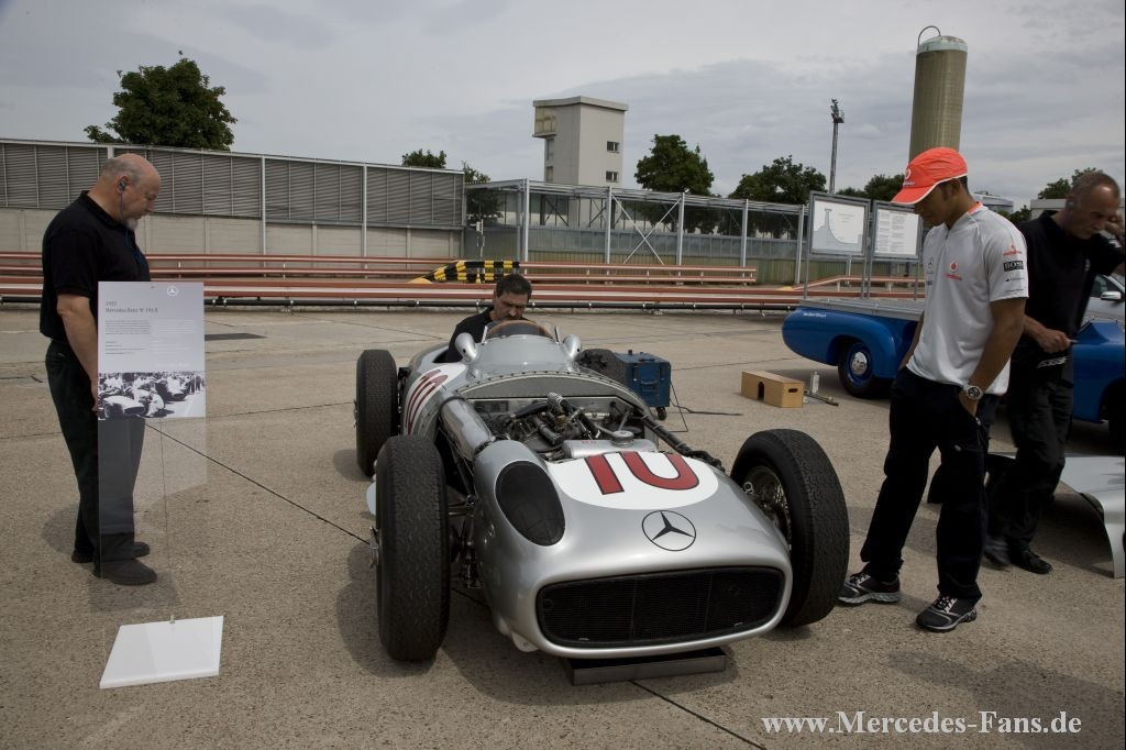 In diesem Jahr feiert Mercedes-Benz 75 Jahre Silberpfeil. Anlässlich der Jubiläumsfeierlichkeiten kamen Formel-1-Pilot Lewis Hamilton und Mercedes-Benz Motorsportchef Norbert Haug zum das Mercedes-Benz Museum nach Stuttgart. Dort sollte im Rahmen der Feier das Weltmeisterfahrzeug von 2008, der MP4-23, per Kran an seinen neuen Platz gehoben werden. Nun sind in der Steilkurve alle legendären Rennwagen seit 1934 zu sehen.