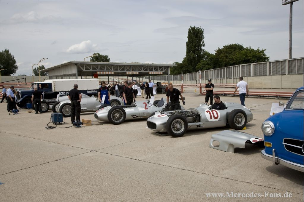 In diesem Jahr feiert Mercedes-Benz 75 Jahre Silberpfeil. Anlässlich der Jubiläumsfeierlichkeiten kamen Formel-1-Pilot Lewis Hamilton und Mercedes-Benz Motorsportchef Norbert Haug zum das Mercedes-Benz Museum nach Stuttgart. Dort sollte im Rahmen der Feier das Weltmeisterfahrzeug von 2008, der MP4-23, per Kran an seinen neuen Platz gehoben werden. Nun sind in der Steilkurve alle legendären Rennwagen seit 1934 zu sehen.