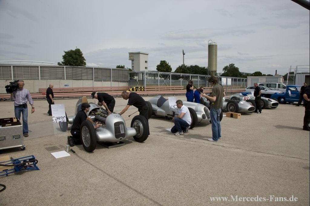 In diesem Jahr feiert Mercedes-Benz 75 Jahre Silberpfeil. Anlässlich der Jubiläumsfeierlichkeiten kamen Formel-1-Pilot Lewis Hamilton und Mercedes-Benz Motorsportchef Norbert Haug zum das Mercedes-Benz Museum nach Stuttgart. Dort sollte im Rahmen der Feier das Weltmeisterfahrzeug von 2008, der MP4-23, per Kran an seinen neuen Platz gehoben werden. Nun sind in der Steilkurve alle legendären Rennwagen seit 1934 zu sehen.
