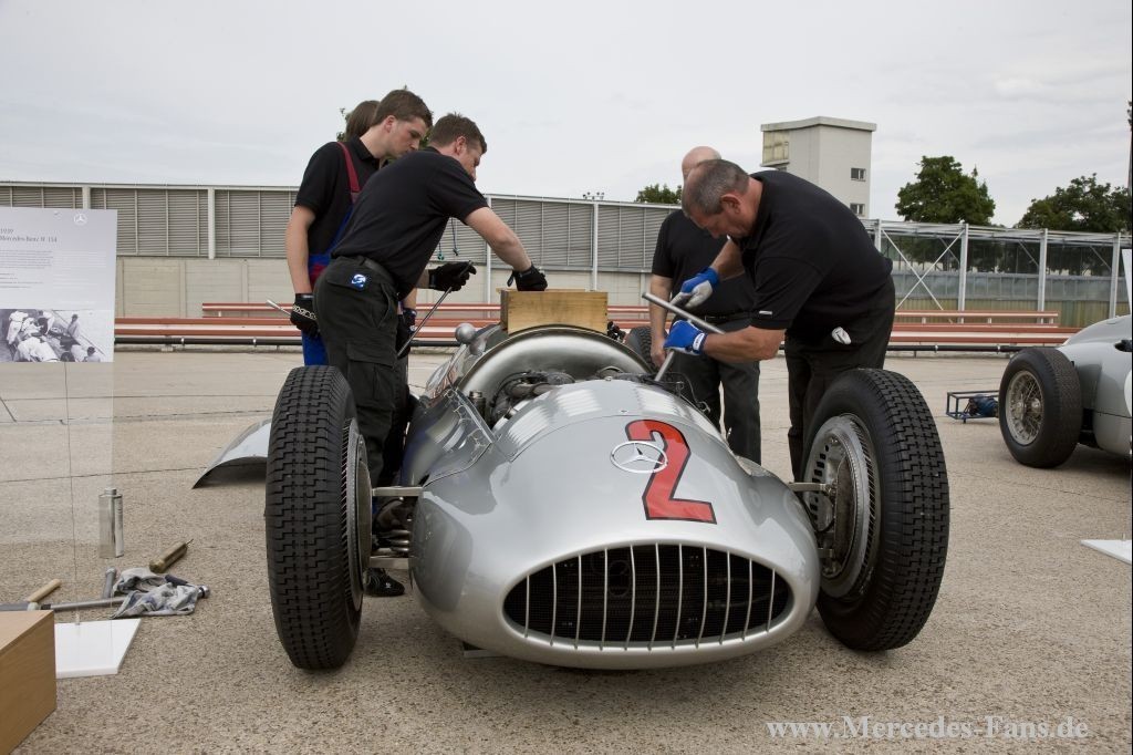 In diesem Jahr feiert Mercedes-Benz 75 Jahre Silberpfeil. Anlässlich der Jubiläumsfeierlichkeiten kamen Formel-1-Pilot Lewis Hamilton und Mercedes-Benz Motorsportchef Norbert Haug zum das Mercedes-Benz Museum nach Stuttgart. Dort sollte im Rahmen der Feier das Weltmeisterfahrzeug von 2008, der MP4-23, per Kran an seinen neuen Platz gehoben werden. Nun sind in der Steilkurve alle legendären Rennwagen seit 1934 zu sehen.