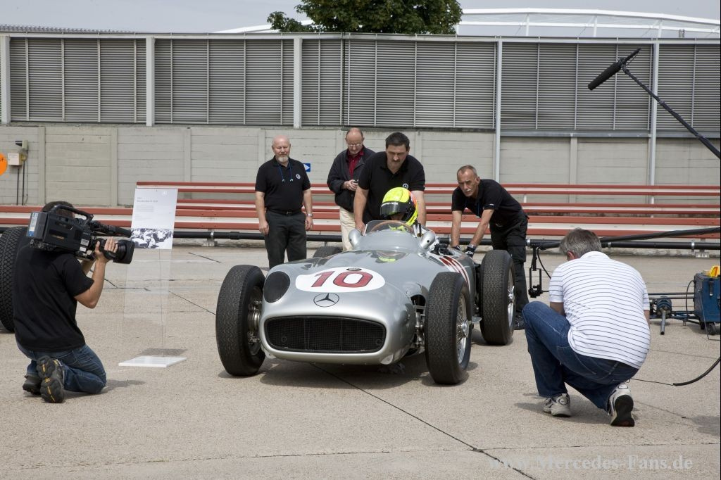 In diesem Jahr feiert Mercedes-Benz 75 Jahre Silberpfeil. Anlässlich der Jubiläumsfeierlichkeiten kamen Formel-1-Pilot Lewis Hamilton und Mercedes-Benz Motorsportchef Norbert Haug zum das Mercedes-Benz Museum nach Stuttgart. Dort sollte im Rahmen der Feier das Weltmeisterfahrzeug von 2008, der MP4-23, per Kran an seinen neuen Platz gehoben werden. Nun sind in der Steilkurve alle legendären Rennwagen seit 1934 zu sehen.