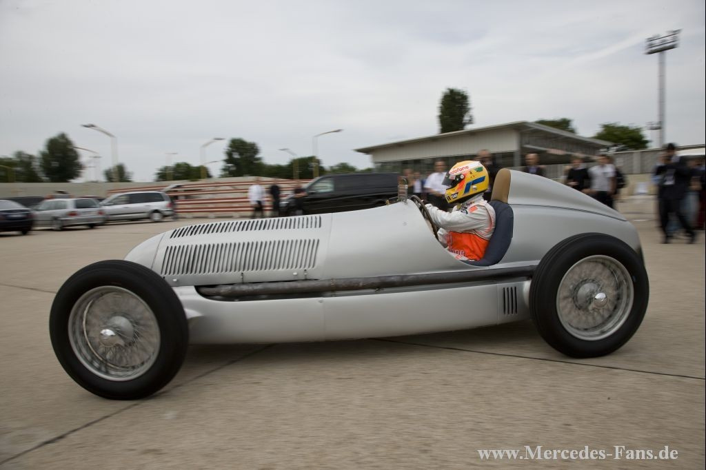 In diesem Jahr feiert Mercedes-Benz 75 Jahre Silberpfeil. Anlässlich der Jubiläumsfeierlichkeiten kamen Formel-1-Pilot Lewis Hamilton und Mercedes-Benz Motorsportchef Norbert Haug zum das Mercedes-Benz Museum nach Stuttgart. Dort sollte im Rahmen der Feier das Weltmeisterfahrzeug von 2008, der MP4-23, per Kran an seinen neuen Platz gehoben werden. Nun sind in der Steilkurve alle legendären Rennwagen seit 1934 zu sehen.
