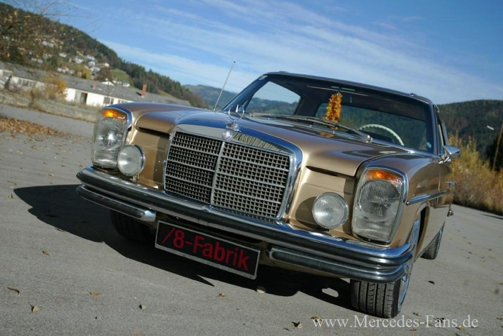 Ach, wie goldig! Obwohl er schon 31 Jahre auf dem hübsch linierten Bechbuckel hat, beeindruckt der Mercedes 250CE als flott gestylter Strahlemann. Zudem Christian Pichler seinem W114 in Gestalt der imposanten Chromfelgen noch mehr Glanz und Gloria gönnte. Ansonsten halten sich die Modifikationen in überschaubaren Grenzen. Einfach nur ein schöner Stern! Und damit goldrichtig für das "Auto der Woche!"