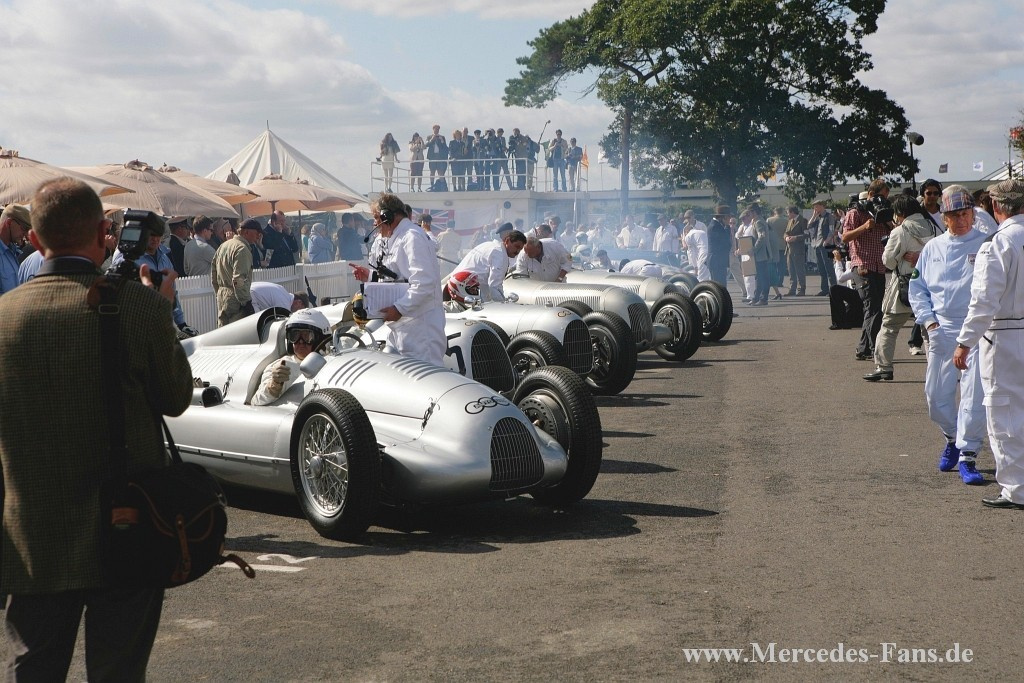 Das Goodwood Revival stand in diesem Jahr ganz und gar unter dem Motto Silberpfeile. Deshalb schickte Mercedes-Benz Classic vier originale Vorkriegs-Silberpfeile auf die Rennstrecke. Die von den Mercedes-Piloten Roland Asch, Jochen Mass, Bernd Schneider, Jackie und Paul Stewart gelenkten historischen Rennfahrzeuge sind echte Originale aus den 1930er Jahren! Auf dem Goodwood Motor Circuit werden in diesem Jahr ein W 25 (1934), ein W 125 (1937), ein W 154 (1939) sowie ein W 165 (1939) ihre Acht- und Zwölfzylindermotoren erklingen lassen. Den vier fahrenden Silberpfeilen stellt Mercedes-Benz Classic einen Renntransporter vom Typ Lo 2750 (1936) zur Seite, wie er seinerzeit zum Transport der ersten Silberpfeile verwendet wurde.
