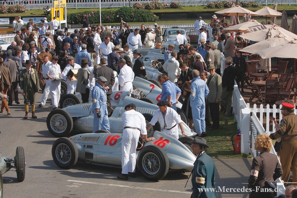 Das Goodwood Revival stand in diesem Jahr ganz und gar unter dem Motto Silberpfeile. Deshalb schickte Mercedes-Benz Classic vier originale Vorkriegs-Silberpfeile auf die Rennstrecke. Die von den Mercedes-Piloten Roland Asch, Jochen Mass, Bernd Schneider, Jackie und Paul Stewart gelenkten historischen Rennfahrzeuge sind echte Originale aus den 1930er Jahren! Auf dem Goodwood Motor Circuit werden in diesem Jahr ein W 25 (1934), ein W 125 (1937), ein W 154 (1939) sowie ein W 165 (1939) ihre Acht- und Zwölfzylindermotoren erklingen lassen. Den vier fahrenden Silberpfeilen stellt Mercedes-Benz Classic einen Renntransporter vom Typ Lo 2750 (1936) zur Seite, wie er seinerzeit zum Transport der ersten Silberpfeile verwendet wurde.