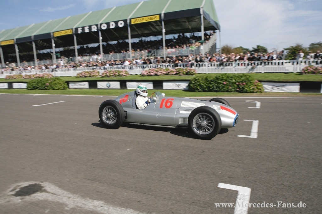 Das Goodwood Revival stand in diesem Jahr ganz und gar unter dem Motto Silberpfeile. Deshalb schickte Mercedes-Benz Classic vier originale Vorkriegs-Silberpfeile auf die Rennstrecke. Die von den Mercedes-Piloten Roland Asch, Jochen Mass, Bernd Schneider, Jackie und Paul Stewart gelenkten historischen Rennfahrzeuge sind echte Originale aus den 1930er Jahren! Auf dem Goodwood Motor Circuit werden in diesem Jahr ein W 25 (1934), ein W 125 (1937), ein W 154 (1939) sowie ein W 165 (1939) ihre Acht- und Zwölfzylindermotoren erklingen lassen. Den vier fahrenden Silberpfeilen stellt Mercedes-Benz Classic einen Renntransporter vom Typ Lo 2750 (1936) zur Seite, wie er seinerzeit zum Transport der ersten Silberpfeile verwendet wurde.