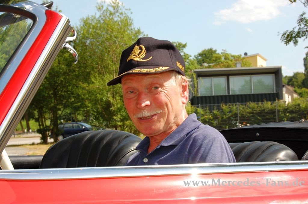 „Hoch soll er leben!“ Ein Mann und sein Mercedes Veteran stießen am 15.7.2010 mit dem Ölkännchen auf ein besonderes Ereignis an. Just an diesem Tag vor 50 Jahren erlebte ein Star unter den Sportwagen-Klassikern seine Erstzulassung. Bei dem Jubiliar, dem man zu seinem tollen Befinden nur gratulieren kann, handelt es sich um den originalen Mercedes 190 SL von Friedrich-W. Thüner . Der Öffentlichkeitsarbeiter im Dienst des Mercedes-Benz Veteranen Club“ lenkt seit 23 Jahren die Geschicke des granada-roten W121 BII.