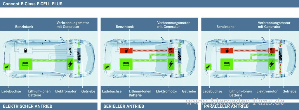 Mit dem Concept B-Class E-CELL PLUS präsentiert Mercedes-Benz auf der IAA 2011 in Frankfurt sein erstes Elektrofahrzeug mit Range Extender. Die Kombination aus einem Elektroantrieb mit einem Benzinmotor sorgt für bestmögliche Alltags- und Langstreckentauglichkeit. Als Energiespeicher kommt eine Lithium-Ionen Batterie der Deutschen Accumotive zum Einsatz, die bis zu 100 Kilometer lokal emissionsfreies Fahren ermöglicht. Dank des zusätzlichen Dreizylinder-Ottomotors summiert sich die Gesamtreichweite des Concept B-Class E-CELL PLUS auf bis zu 600 km. Das auf der IAA 2011 vorgestellte Konzeptfahrzeug gibt einen Ausblick auf die Serieneinführung im Jahr 2014. Damit ergänzt Mercedes-Benz die Familie der Elektrofahrzeuge um ein universell einsetzbares batterieelektrisches Fahrzeug mit Range Extender.