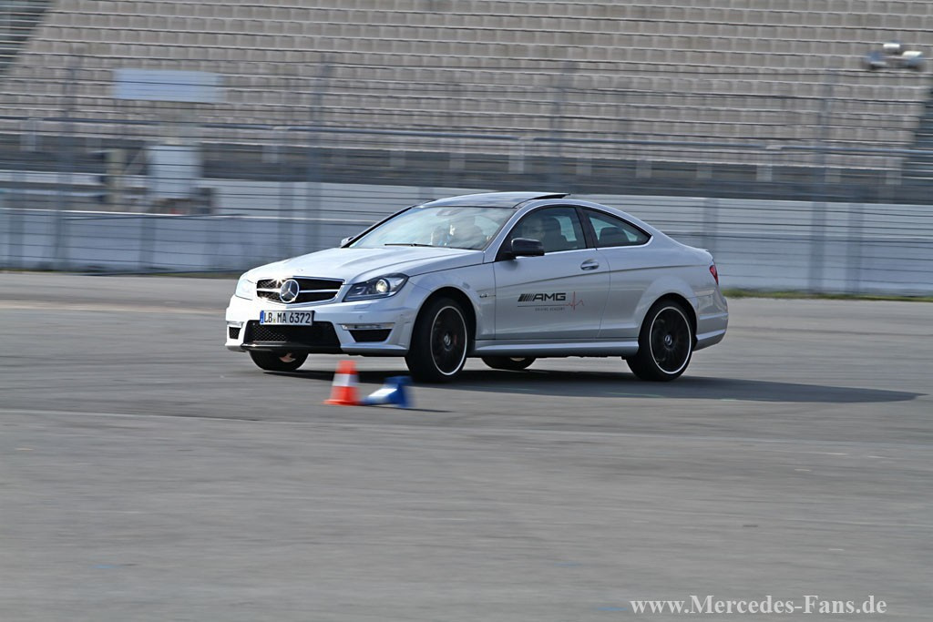 Das 6.3 Liter-V8-Triebwerk von AMG heult kurz auf und wird sogleich vom sonoren Grollen aus vier manierlichen Endrohren übertönt. Die letzten Vögel fliegen verschreckt aus den Baumkronen der am Hockenheimring stehenden Nadelgewächse. Es ist Zeit für die AMG Driving Academy! Blitzschnell startet das C63 Coupé durch den Slalomkurs. Die Conti-Reifen bewegen sich hart an ihrer Grenze und sorgen dafür, dass der Mercedes die Bodenhaftung nicht verliert. Der Fahrer zirkelt das Coupé durchs letzte Pylonenpaar und legt eine saubere 180°-Wende auf den Asphalt. Am Steuer sitzt nicht etwa ein Rallyepilot, sondern der Gewinner des AMG Driving Academy Advanced-Fahrtrainings, der 20-jährige Joschka Busch aus Wuppertal und lacht verschmitzt: "Am C63 mag ich seine Wendigkeit und das agile Ansprechverhalten des Motors. Genau das Richtige für mich!"