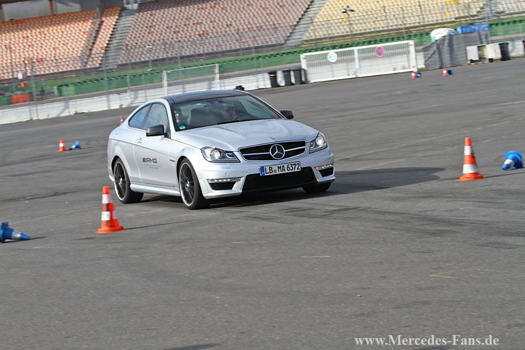 Das 6.3 Liter-V8-Triebwerk von AMG heult kurz auf und wird sogleich vom sonoren Grollen aus vier manierlichen Endrohren übertönt. Die letzten Vögel fliegen verschreckt aus den Baumkronen der am Hockenheimring stehenden Nadelgewächse. Es ist Zeit für die AMG Driving Academy! Blitzschnell startet das C63 Coupé durch den Slalomkurs. Die Conti-Reifen bewegen sich hart an ihrer Grenze und sorgen dafür, dass der Mercedes die Bodenhaftung nicht verliert. Der Fahrer zirkelt das Coupé durchs letzte Pylonenpaar und legt eine saubere 180°-Wende auf den Asphalt. Am Steuer sitzt nicht etwa ein Rallyepilot, sondern der Gewinner des AMG Driving Academy Advanced-Fahrtrainings, der 20-jährige Joschka Busch aus Wuppertal und lacht verschmitzt: "Am C63 mag ich seine Wendigkeit und das agile Ansprechverhalten des Motors. Genau das Richtige für mich!"