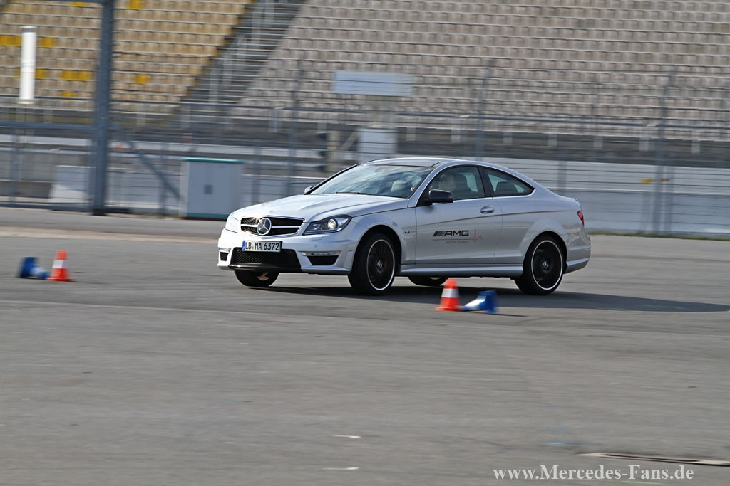 Das 6.3 Liter-V8-Triebwerk von AMG heult kurz auf und wird sogleich vom sonoren Grollen aus vier manierlichen Endrohren übertönt. Die letzten Vögel fliegen verschreckt aus den Baumkronen der am Hockenheimring stehenden Nadelgewächse. Es ist Zeit für die AMG Driving Academy! Blitzschnell startet das C63 Coupé durch den Slalomkurs. Die Conti-Reifen bewegen sich hart an ihrer Grenze und sorgen dafür, dass der Mercedes die Bodenhaftung nicht verliert. Der Fahrer zirkelt das Coupé durchs letzte Pylonenpaar und legt eine saubere 180°-Wende auf den Asphalt. Am Steuer sitzt nicht etwa ein Rallyepilot, sondern der Gewinner des AMG Driving Academy Advanced-Fahrtrainings, der 20-jährige Joschka Busch aus Wuppertal und lacht verschmitzt: "Am C63 mag ich seine Wendigkeit und das agile Ansprechverhalten des Motors. Genau das Richtige für mich!"