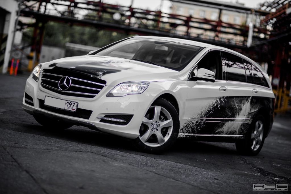 Ja, es gibt beliebtere Mercedes-Modelle als die R-Klasse. Nein, sie ist für individuellen Fahrspaß nicht ungeeignet. Mit einer guten Idee für den etwas anderen Auftritt zieht man auch mit einer Mercedes R-Klasse alle Blicke auf seine Seite - so wie mit diesem Exemplar, das auf seiner Karosserie Bilder der Protagonisten aus dem Hooywood Blockbuster "The Dark Knight" - Batman und Joker - zum Besten gibt.