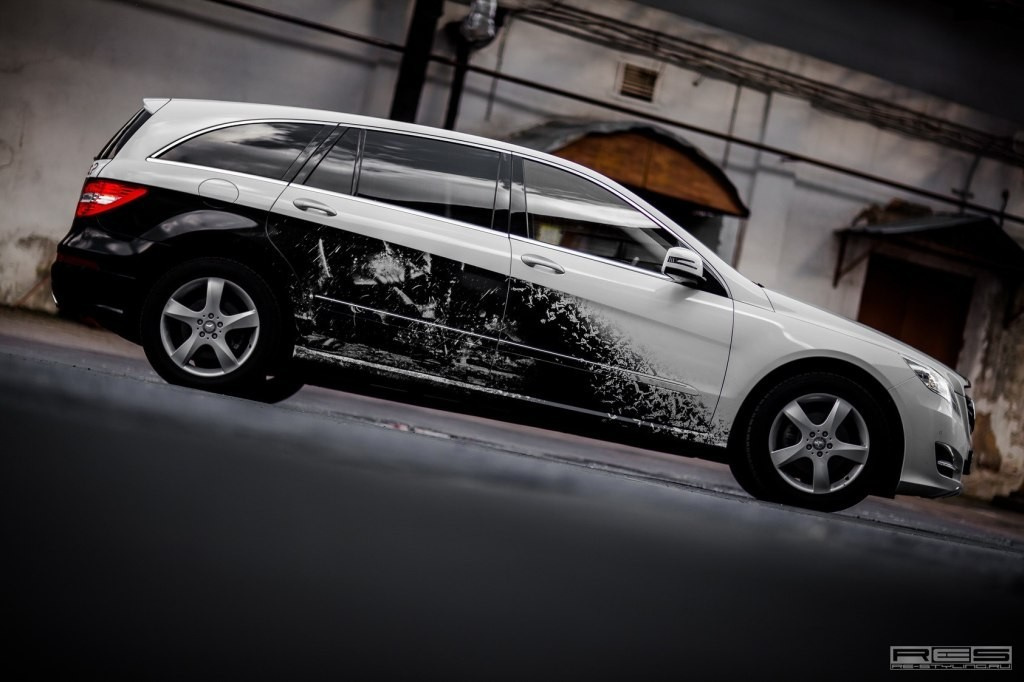Ja, es gibt beliebtere Mercedes-Modelle als die R-Klasse. Nein, sie ist für individuellen Fahrspaß nicht ungeeignet. Mit einer guten Idee für den etwas anderen Auftritt zieht man auch mit einer Mercedes R-Klasse alle Blicke auf seine Seite - so wie mit diesem Exemplar, das auf seiner Karosserie Bilder der Protagonisten aus dem Hooywood Blockbuster "The Dark Knight" - Batman und Joker - zum Besten gibt.