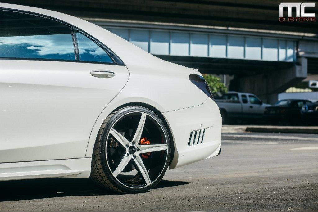Der Mercedes S550 ist eine nur in Nordamerika angebotene Langversion des S500. Doch auf die Länge kommt es bei dem von US-Tuner MC Customs modifizierten weißen Reisen nicht an. Eher schon auf die Breite. Die Augen des Betrachters müssen schon im Weitwinkel-Modus justiert sein, um das Widebody-Kit in Gänze zu erfassen.