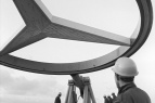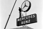 1965 wird ein zehn Meter hoher, drehbarer Mercedes-Stern auf dem Dach des Europa-Centers am Kurfürstendamm in Berlin installiert (links hinten) und am 30. März 1965 eingeweiht. Es ist damals die größte drehbare und hydraulisch kippbare Neonanlage der Welt.