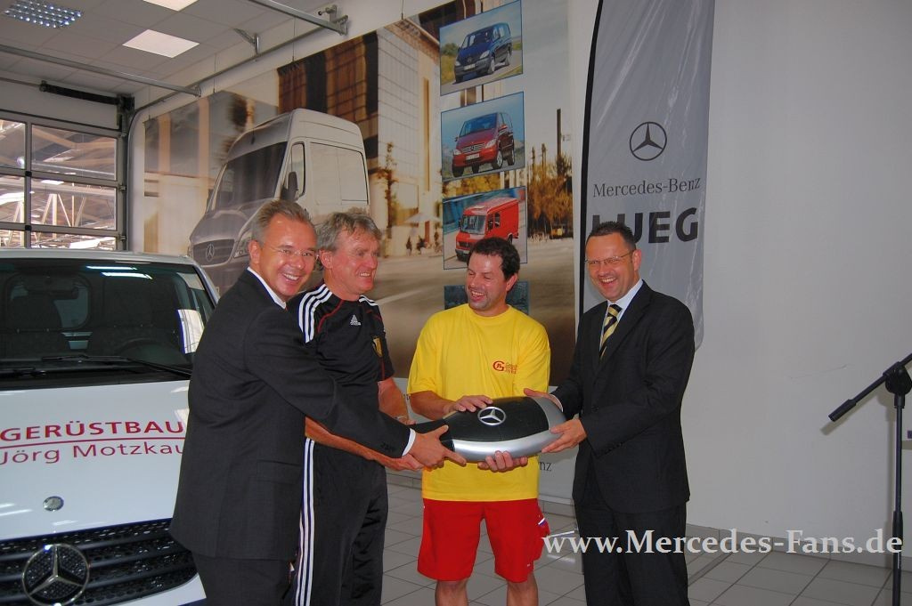 Eine schönere Aktion rund um das Thema Nutzfahrzeuge - und noch dazu im Jahr der WM - konnte man sich gar nicht einfallen lassen. Die Aktion "Meister vs. Meister" meint Weltmeister gegen Handwerksmeister und mobilisierte Zigtausende, die nicht nur einmal gegen ihre Idole antreten wollten, sondern auch einen Mercedes Vito gewinnen konnten. Ein Velberter Handwerksbetrieb zog sich gegen Sepp Maier und Co. am besten aus der Affäre. Im LUEG Nutzfahrzeug-Center Bochum-Wattenscheid durfte Jörg Motzkau seinen Vito in Empfang nehmen!