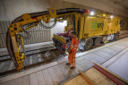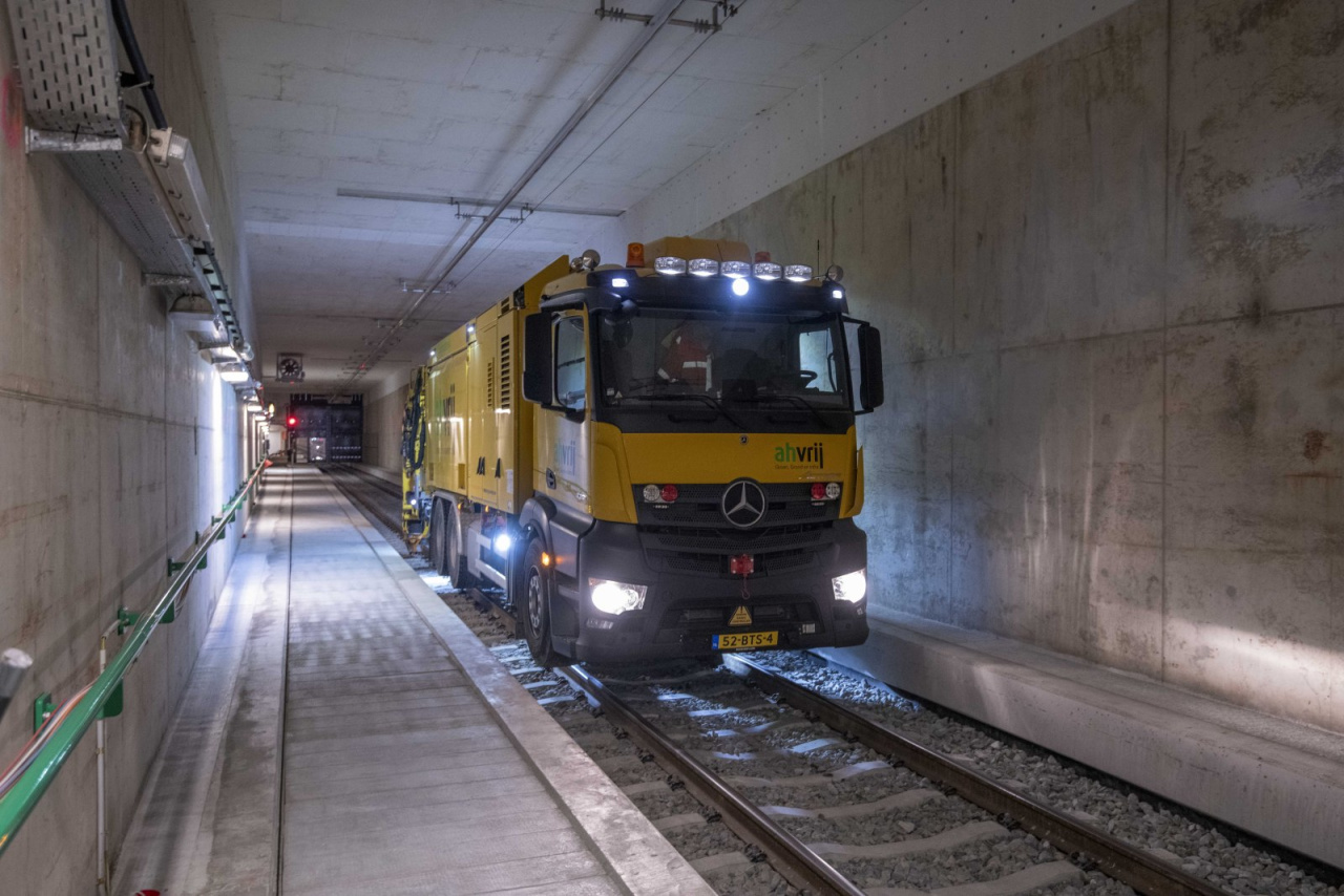 Wie ein Staubsauger: Actros auf Schienen reinigt Gleisbett