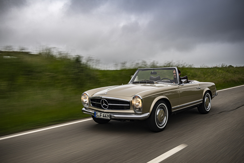 280 SL „Pagode“ (W 113) von 1968. Fahraufnahme. Mercedes-Benz Classic Insight „Mythos SL“, 2021.