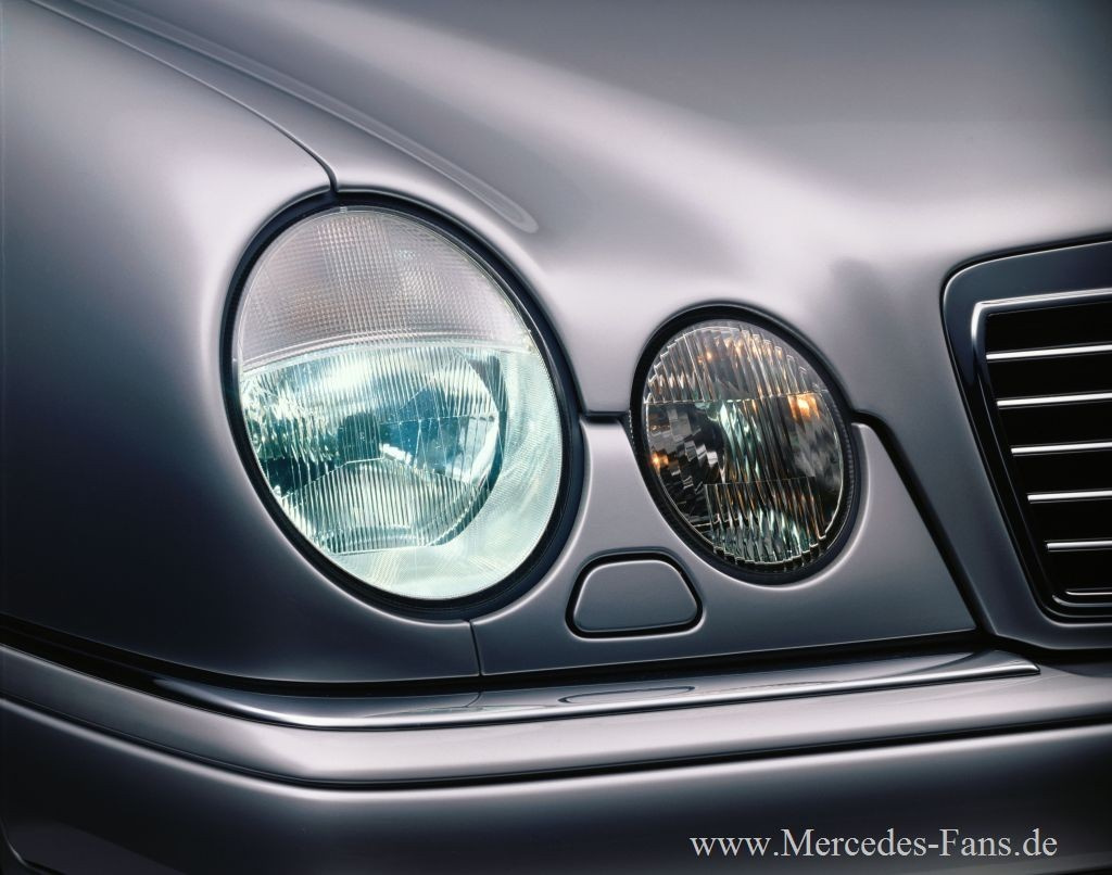 Mercedes-Benz eine markante Frontpartie mit vier elliptischen Scheinwerfern. Für Aufsehen sorgt außerdem die coupéähnliche Heckgestaltung. Beide Designelemente, die sich deutlich von der vergleichsweise strengen Linienführung der Baureihe 124 abheben, werden von Fachleuten und Öffentlichkeit sehr positiv aufgenommen. Prompt wird die Limousine W 210 mit dem renommierten Designpreis red dot design award (Designpreis Roter Punkt) ausgezeichnet. Die neue E-Klasse zeichnet sich jedoch nicht nur durch ihre unverwechselbare Gestalt, sondern durch den Einsatz von mehr als 30 technischen Neuerungen aus. Bemerkenswert ist außerdem der sensationell niedrige Luftwiderstandsbeiwert von cw=0,27.