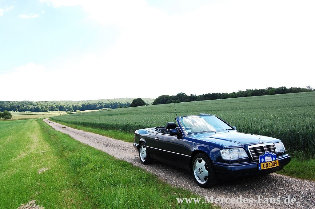 Kaum zu glauben, dass die Baureihe124 im Jahr 2009 ein Vierteljahrhundert alt wurde. Den zeitlosen Linien dieser Mercedes E-Klasse sieht man das Dienstjubiläum wirklich nicht an. Und dennoch ist der kantige Schwabe auf dem besten Wege zum Klassiker. Das gilt ganz sicher auch für das azurit-blaue Cabrio von Ulrich Nelting. Es ist ein rares Modell aus der „Final Edition“- Serie, die Mercedes 1996 und 1997 zum Auslauf der Modellreihe noch vom Band gelassen hat.