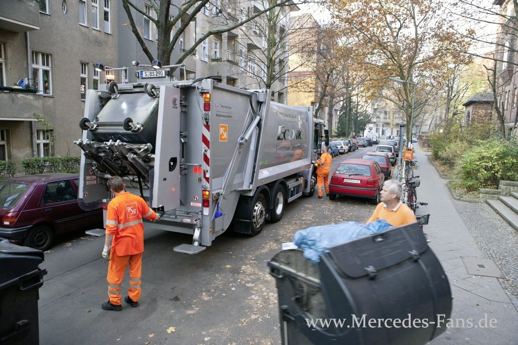 Es ist frühmorgens kurz nach 6.00 Uhr im Berliner Stadtteil Friedenau. Die hellsten Punkte sind die Scheinwerfer und Rundumkennleuchten des Mercedes-Benz Econic. Das lauteste Geräusch sind die Motoren der wenigen Pkw und Verteilerfahrzeuge rundum. Auf Tour mit einem Müllsammelfahrzeug, aber einem ganz besonderen. Es ist ein Unikat mit großem Potenzial: der sparsame und leise Mercedes-Benz Econic BlueTec Hybrid.