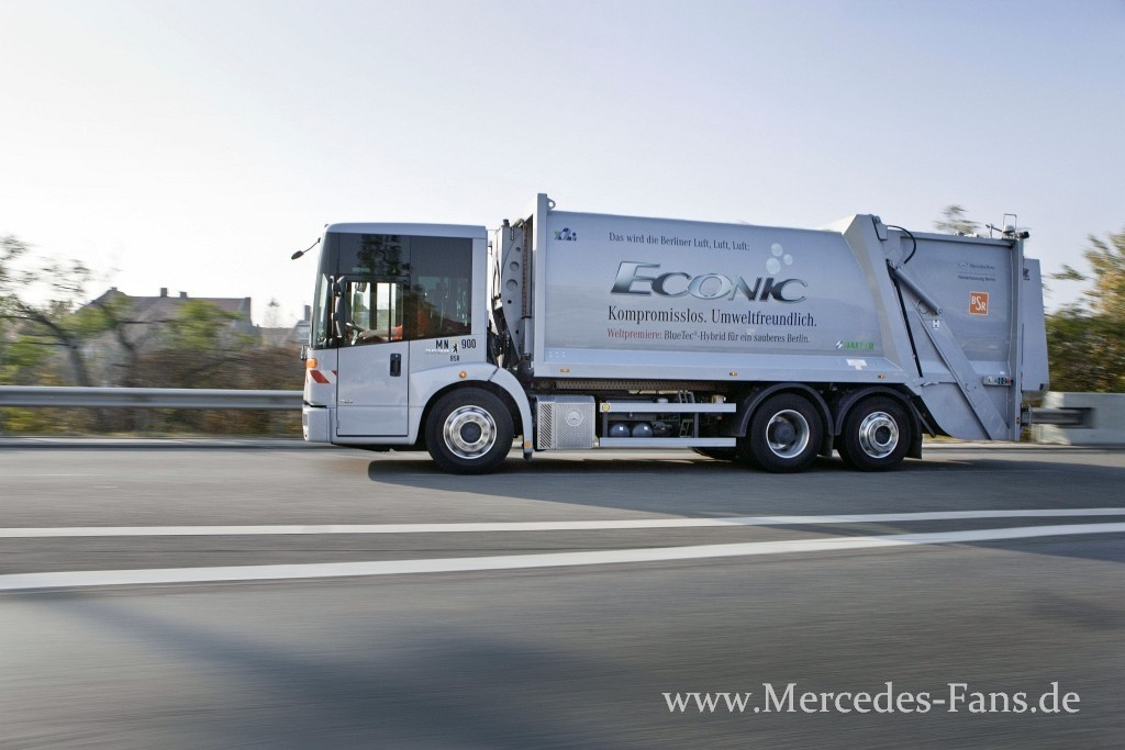 Es ist frühmorgens kurz nach 6.00 Uhr im Berliner Stadtteil Friedenau. Die hellsten Punkte sind die Scheinwerfer und Rundumkennleuchten des Mercedes-Benz Econic. Das lauteste Geräusch sind die Motoren der wenigen Pkw und Verteilerfahrzeuge rundum. Auf Tour mit einem Müllsammelfahrzeug, aber einem ganz besonderen. Es ist ein Unikat mit großem Potenzial: der sparsame und leise Mercedes-Benz Econic BlueTec Hybrid.
