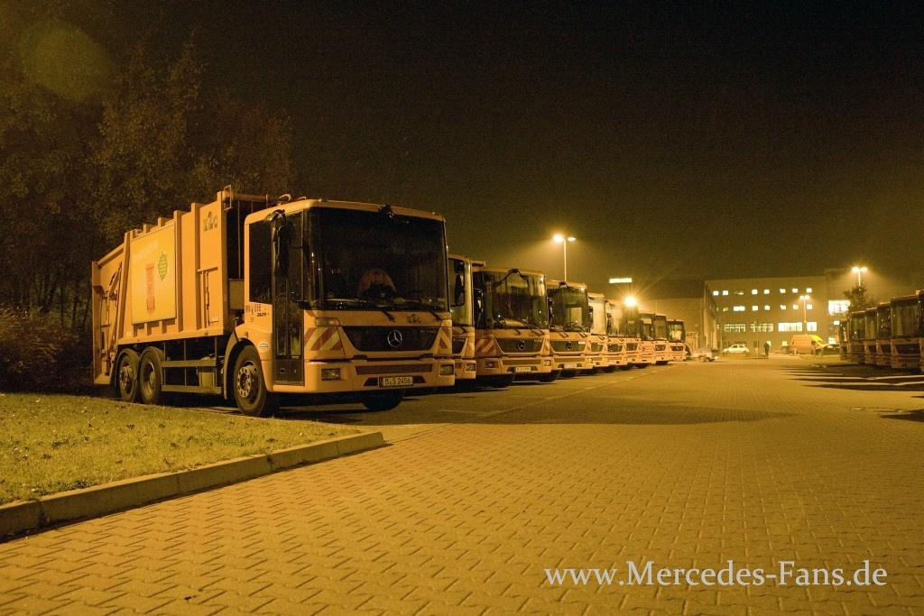 Es ist frühmorgens kurz nach 6.00 Uhr im Berliner Stadtteil Friedenau. Die hellsten Punkte sind die Scheinwerfer und Rundumkennleuchten des Mercedes-Benz Econic. Das lauteste Geräusch sind die Motoren der wenigen Pkw und Verteilerfahrzeuge rundum. Auf Tour mit einem Müllsammelfahrzeug, aber einem ganz besonderen. Es ist ein Unikat mit großem Potenzial: der sparsame und leise Mercedes-Benz Econic BlueTec Hybrid.