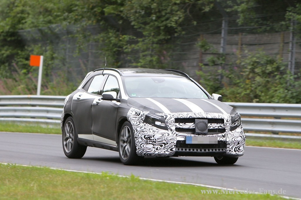 Nachdem Mercedes-Benz letzte Woche den neuen GLA vorgestellt hat, dreht der hochmotorisierte GLA 45 noch ein paar Testrunden am Nürburgring. Leider immer noch getarnt, aber in einer Tarnstufe wie wir ihn noch nie fotografiert haben. Hinten erkennt man jetzt erstmals die neuen Endrohre des aus der A-Klasse 45 AMG stammenden Motor. Der GLA 45 AMG wird noch in diesem Jahr als 2014er Modell vorgestellt.