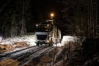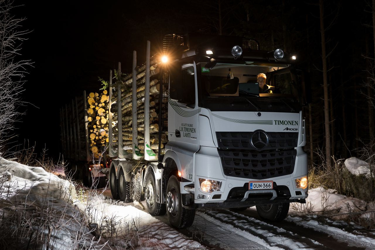 Ein Mercedes Benz Arocs ist in Finnland schwer auf dem Holzweg