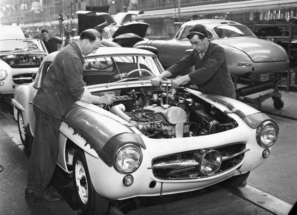 Mercedes-Benz 190 SL (W 121), Produktionszeitraum 1955 bis 1963. Foto der Montage im Mercedes-Benz Werk Sindelfingen.