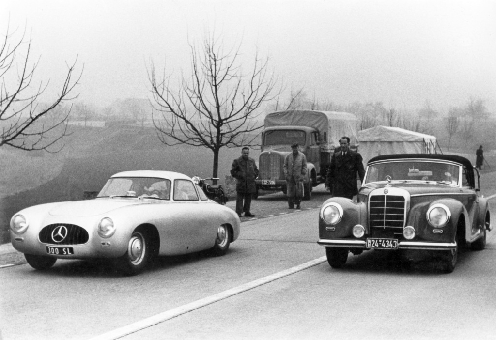 Mercedes-Benz 300 SL Rennsportwagen (W 194) aus dem Jahr 1952. Foto von der Pressepräsentation auf der Autobahn bei Stuttgart am 12. März 1952. Rechts neben dem neuen Rennsportwagen ein Mercedes-Benz 300 S Cabriolet (W 188)
