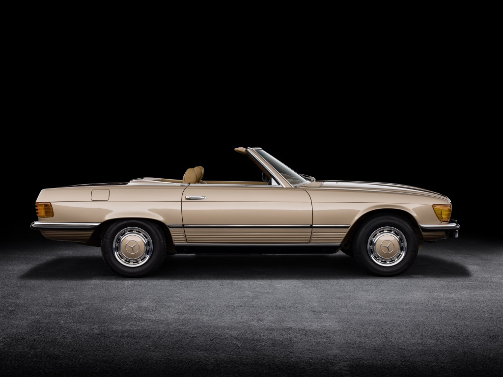 Mercedes-Benz 350 SL (R 107, Produktionszeitraum 1971 bis 1989). Der Typ wird bis 1985 gebaut. Studiofoto von rechts.