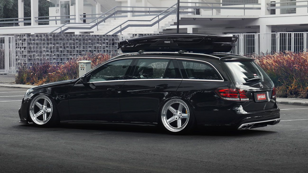 Tief-Schwarz: Unten angekommen steht das E63 T-Modell auf seinen 20-zölliigen Rotiform besser da