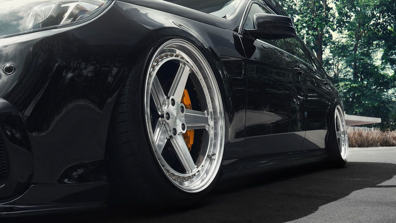 Tief-Schwarz: Unten angekommen steht das E63 T-Modell auf seinen 20-zölliigen Rotiform besser da