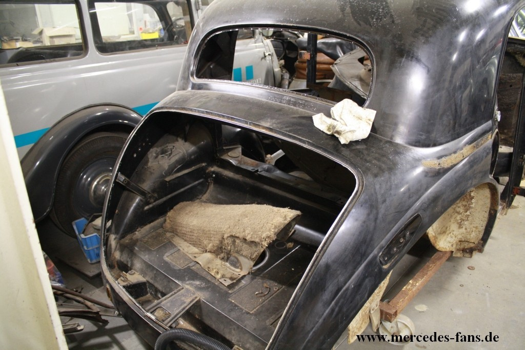 Es hat sich viel getan, seit wir das letzte Mal in der Hallen von Jörg Enger in Krefeld waren – Das sich mittlerweile auf vier Nachwuchs-Schrauber kristallisierte Team hat den 220er mittlerweile in die Hauptbestandteile zerlegt, die jetzt in mühseliger Handarbeit gereinigt werden. Dabei lässt Altmeister Jörg Enger den jungen Mercedes-Fans lange Leine und greift nur selten direkt ein, stellt aber zu jeder Zeit das Know-How und die Peripherie bereit, die das Projekt benötigt.
