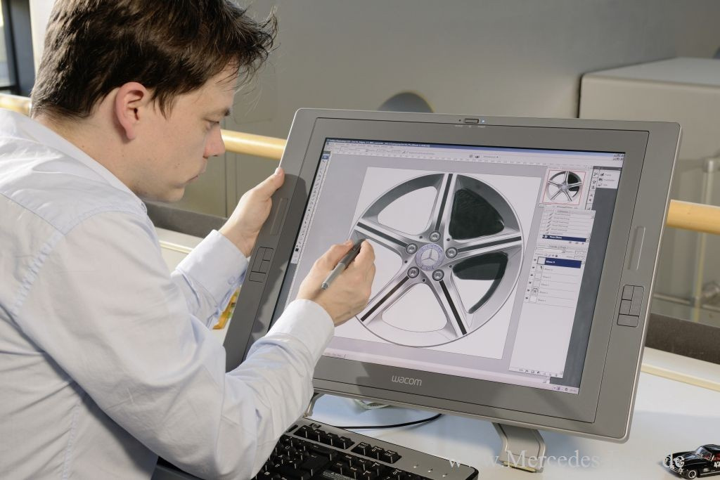Ohne Räder läuft gar nichts diese elementare Feststellung beschreibt nicht nur die technische Grundvoraussetzung für ein funktionierendes Automobil, sondern auch die Bedeutung des Rades für ein überzeugendes Fahrzeugdesign. Deshalb tragen bei Mercedes-Benz anspruchsvoll gestaltete Räder, die mit dem Karosseriekörper harmonieren und als gestalterisch logische Fortsetzung erscheinen, entscheidend zur hohen Designgüte der Gesamtfahrzeuge bei. Im Designzentrum von Mercedes-Benz werden die Leichtmetallräder für die Serien- oder Sonderausstattung von Spezialisten in jenem Bereich gestaltet, der auch die gesamten Exterieurformen entwirft.